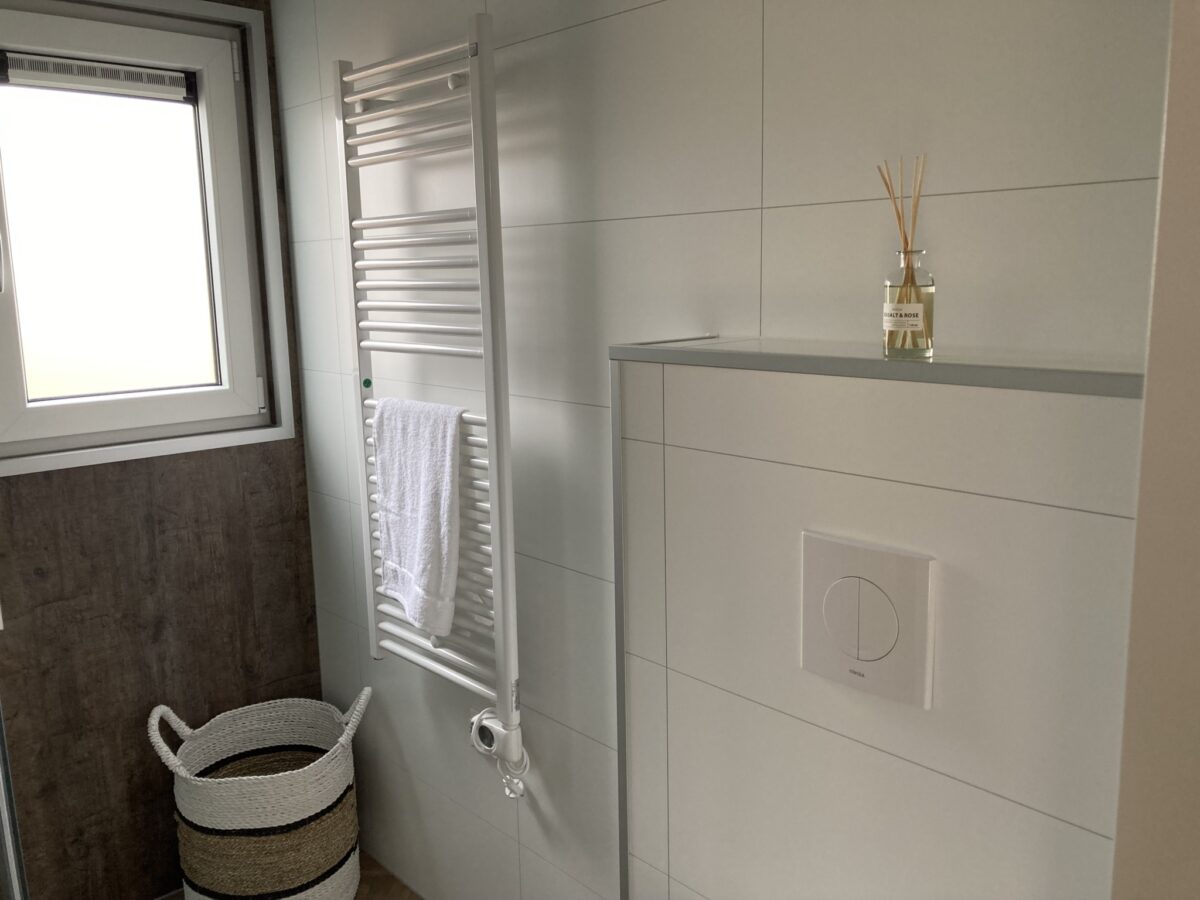 - Salle de bain avec douche spacieuse, robinet thermostatique, meuble sous vasque avec miroir et spots, WC flottant, radiateur sèche-serviettes, ventilateur électrique