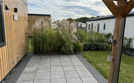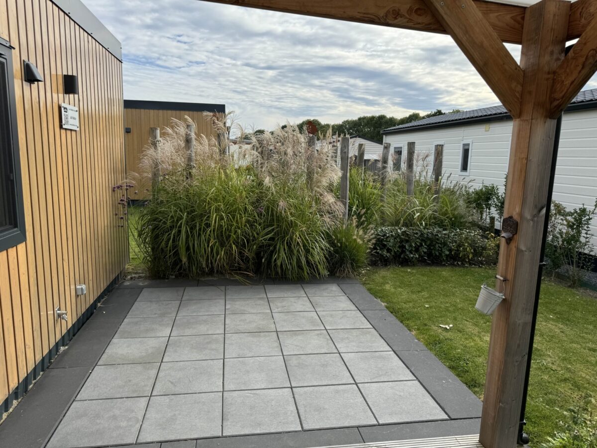 Un jardin hollandais traditionnel entoure le chalet. Le terrain mesure 218m², offre un grand parking et un abri de jardin de 8m² avec électricité et connexion pour une machine à laver.