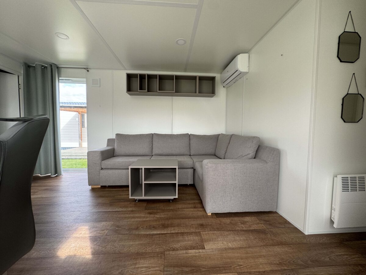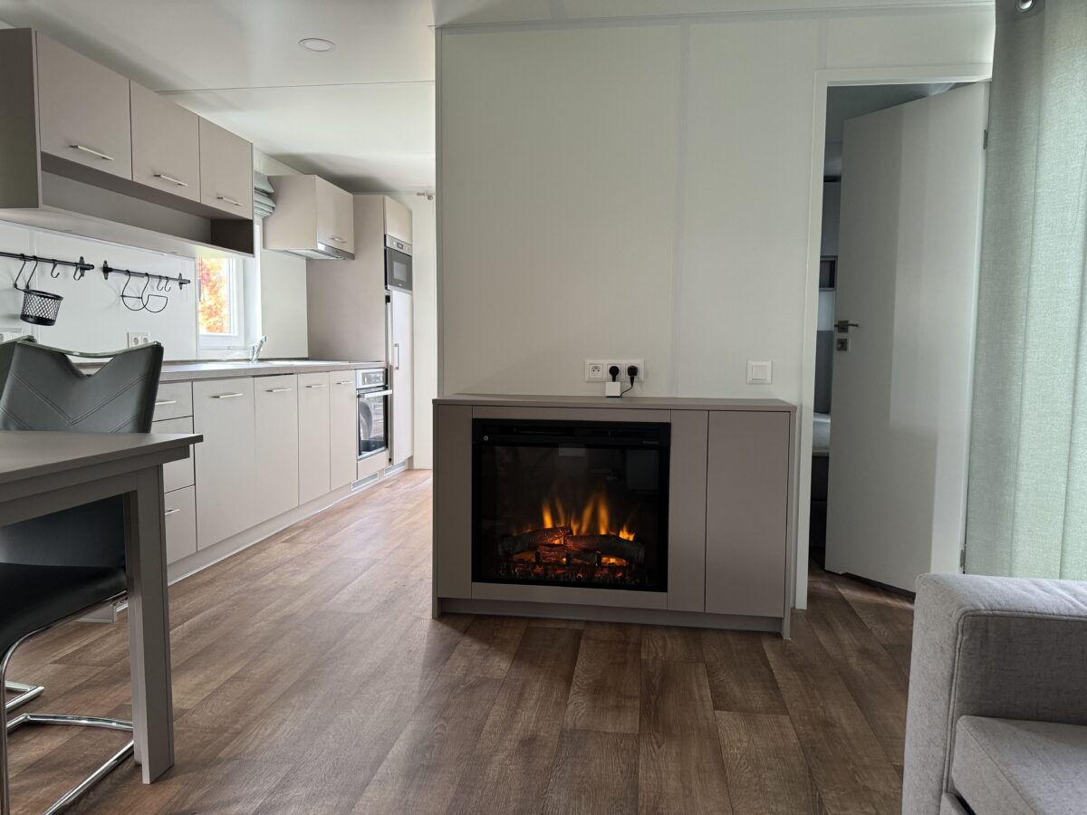 Un salon ouvert et spacieux avec beaucoup d'espace, équipé d'un canapé-lit, du WIFI, de la climatisation contrôlable par APP, d'un radiateur soufflant et d'une cheminée électrique, apportant ambiance et chaleur.