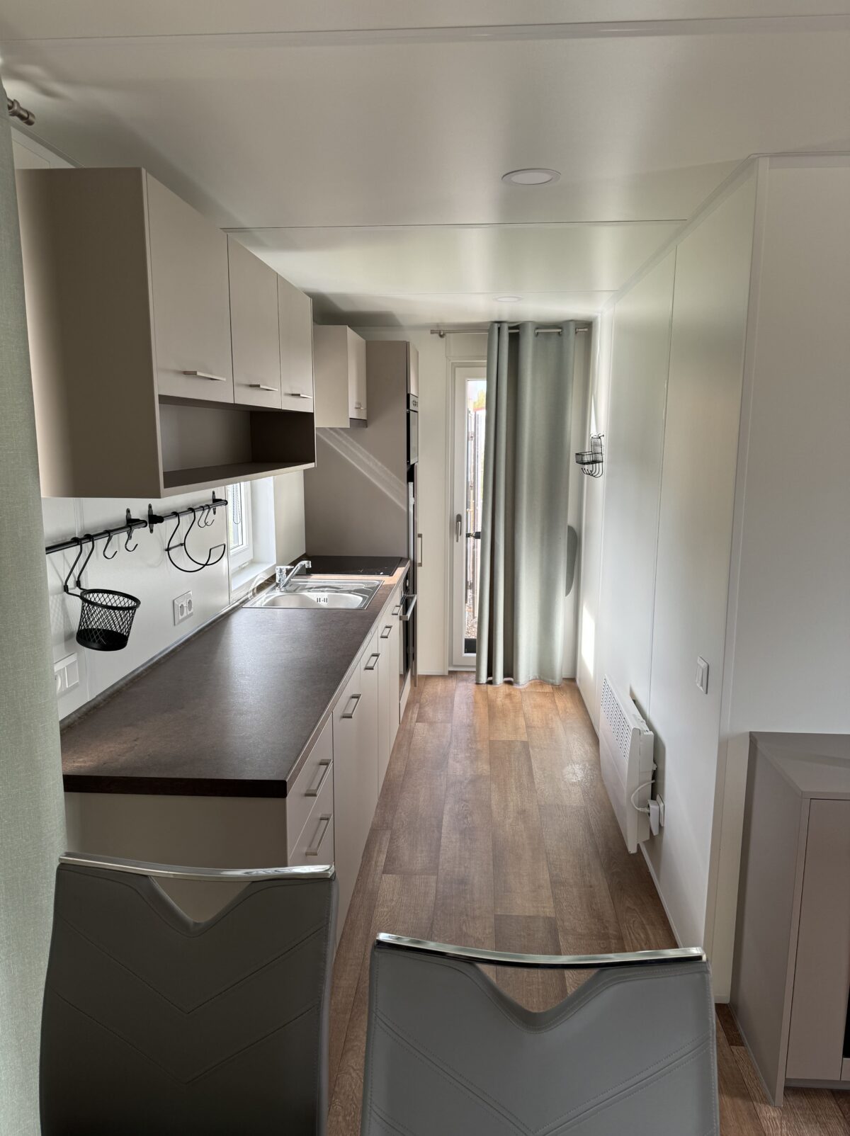 Cuisine entièrement équipée avec des appareils modernes, notamment une plaque à induction, un réfrigérateur, un four à micro-ondes et un lave-vaisselle.