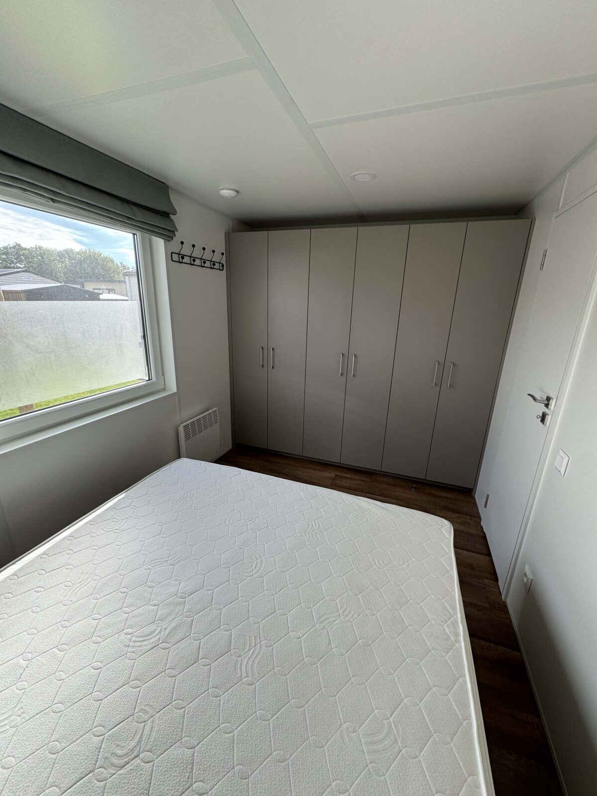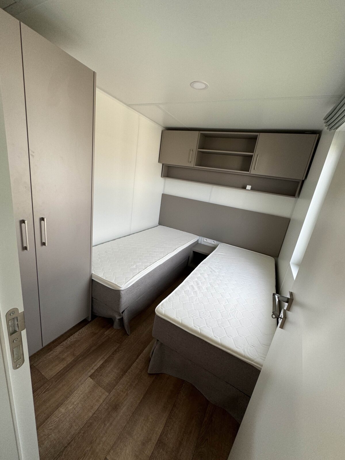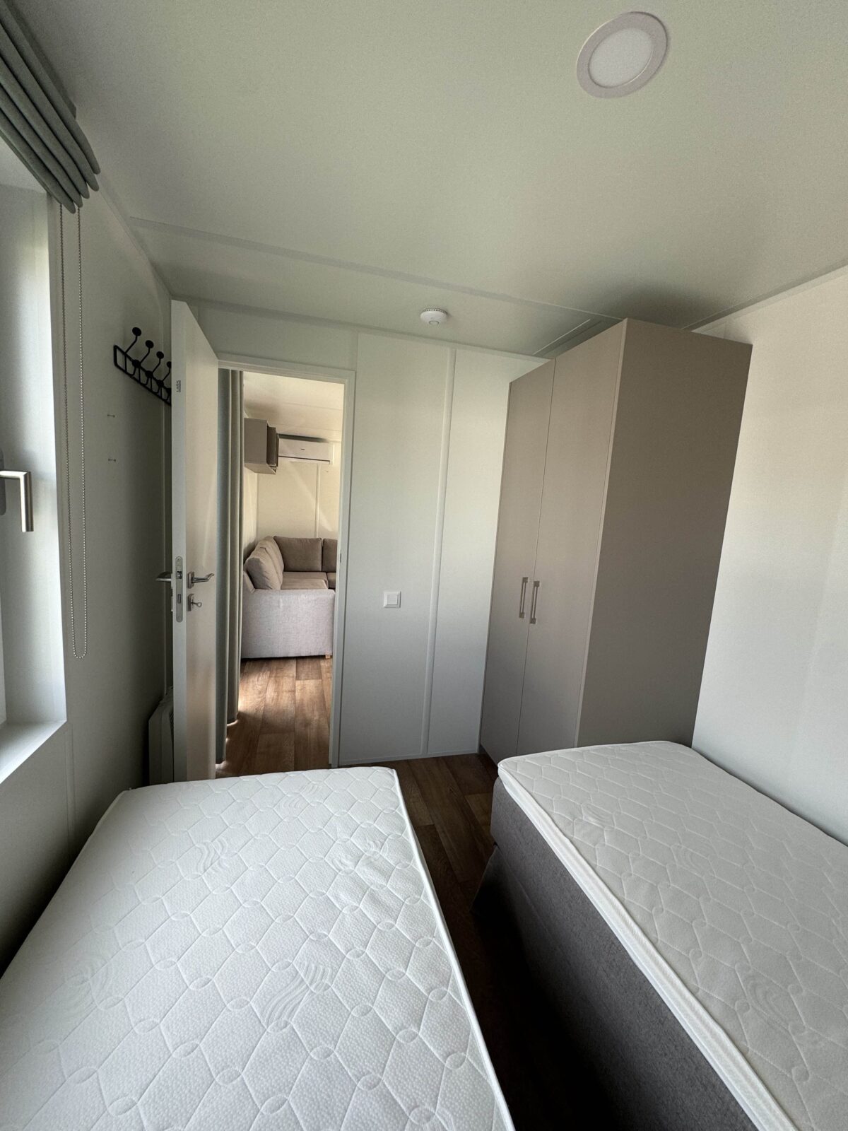 Deux chambres confortables, chacune avec des lits à sommier (2 x 80 x 200 cm), une armoire, un éclairage LED moderne et un radiateur à ventilateur.