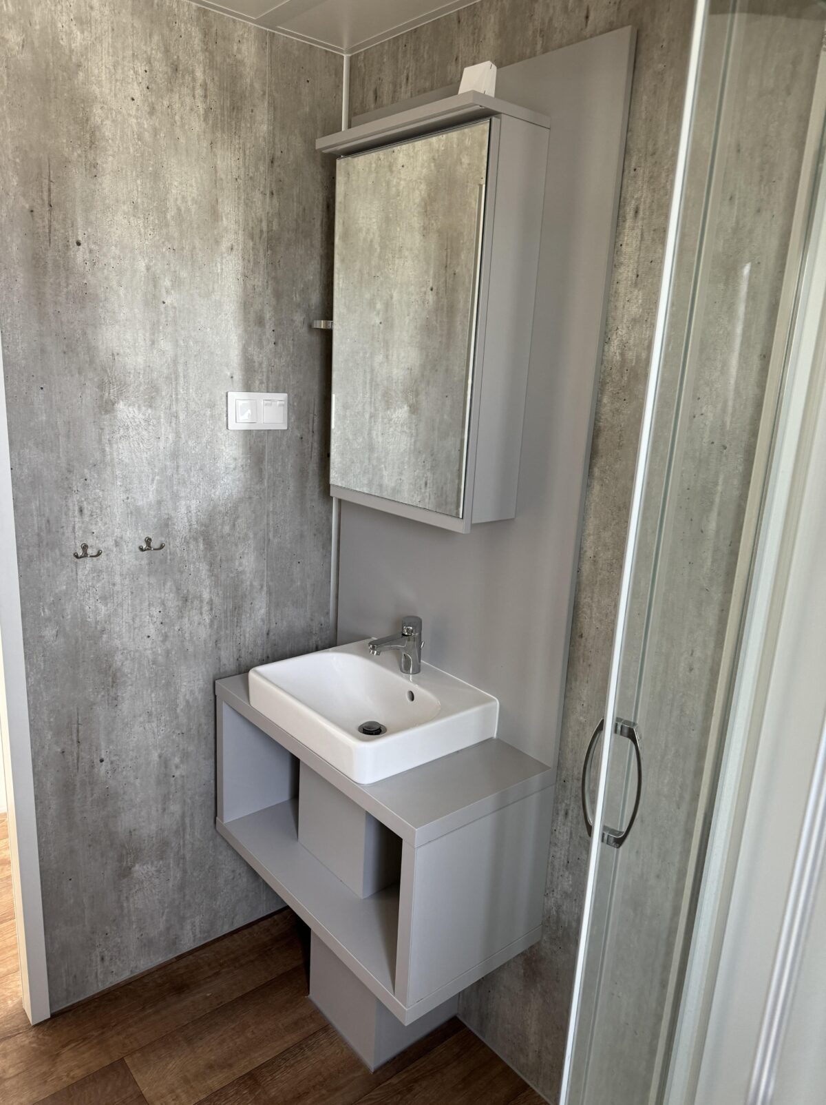 Une salle de bain moderne avec une douche spacieuse, un radiateur électrique pour les serviettes et un ventilateur électrique.