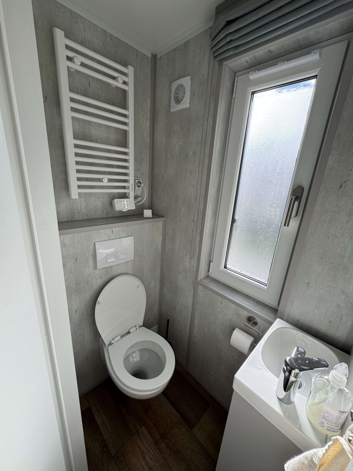 WC séparés avec fenêtre, lavabo et sèche-serviettes électrique.