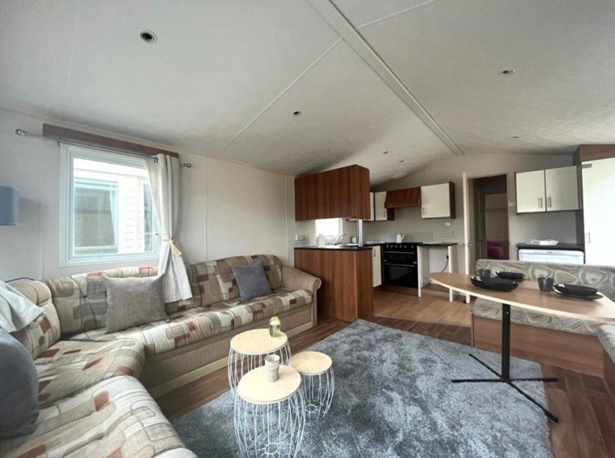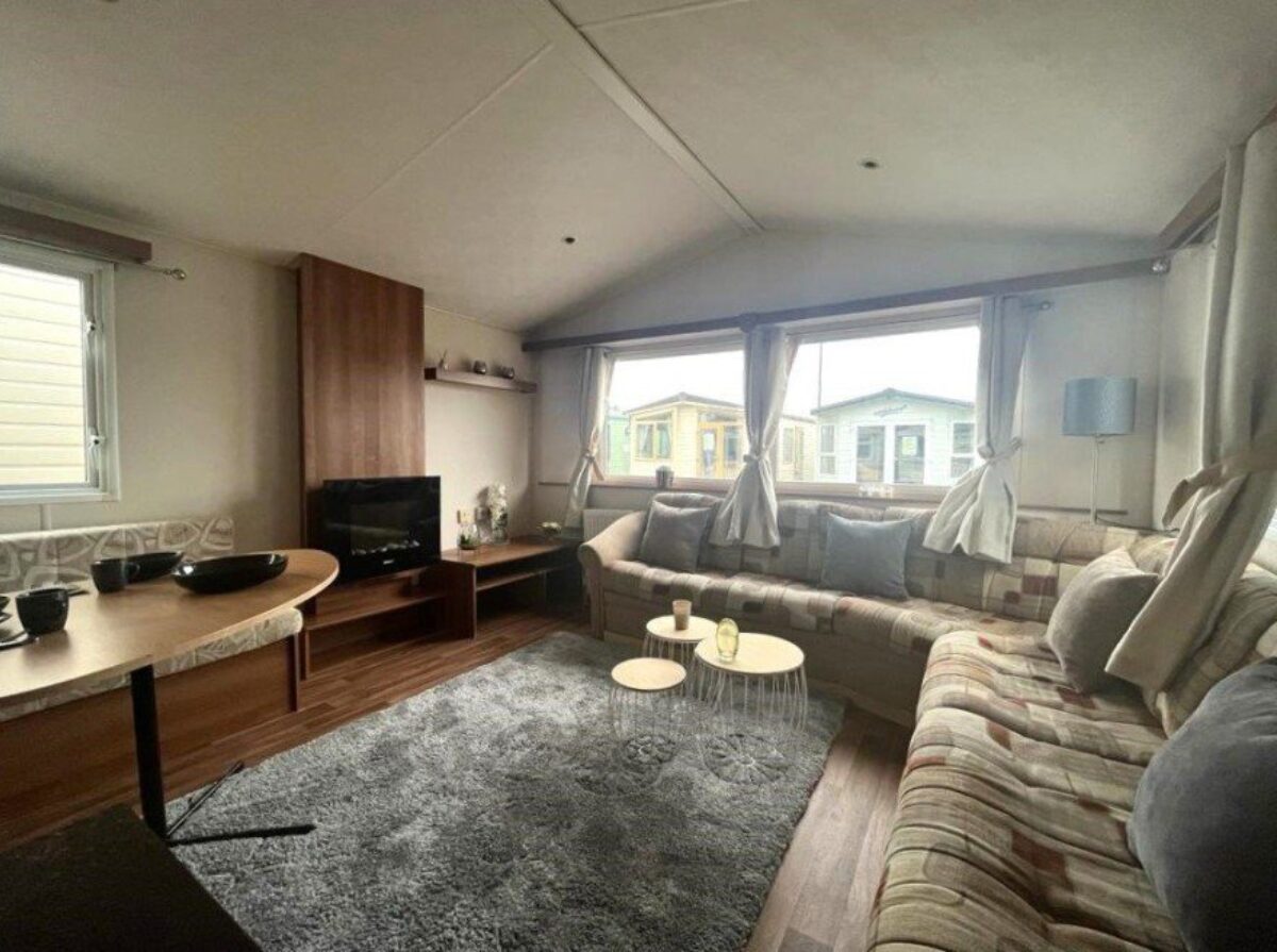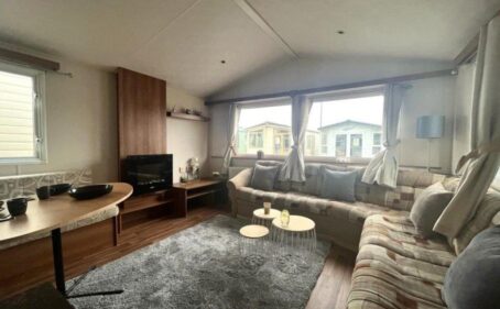 Salon spacieux avec grand canapé et cheminée chaleureuse
