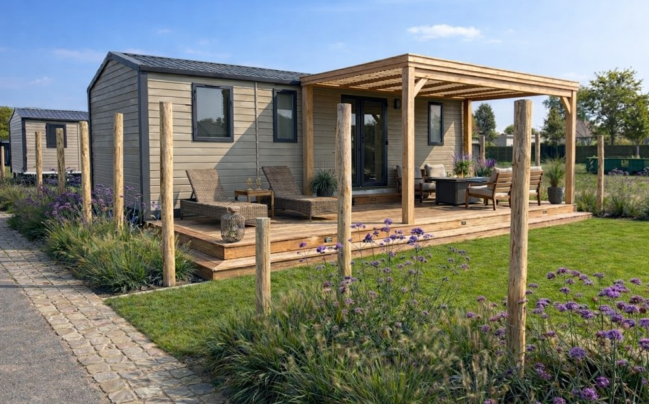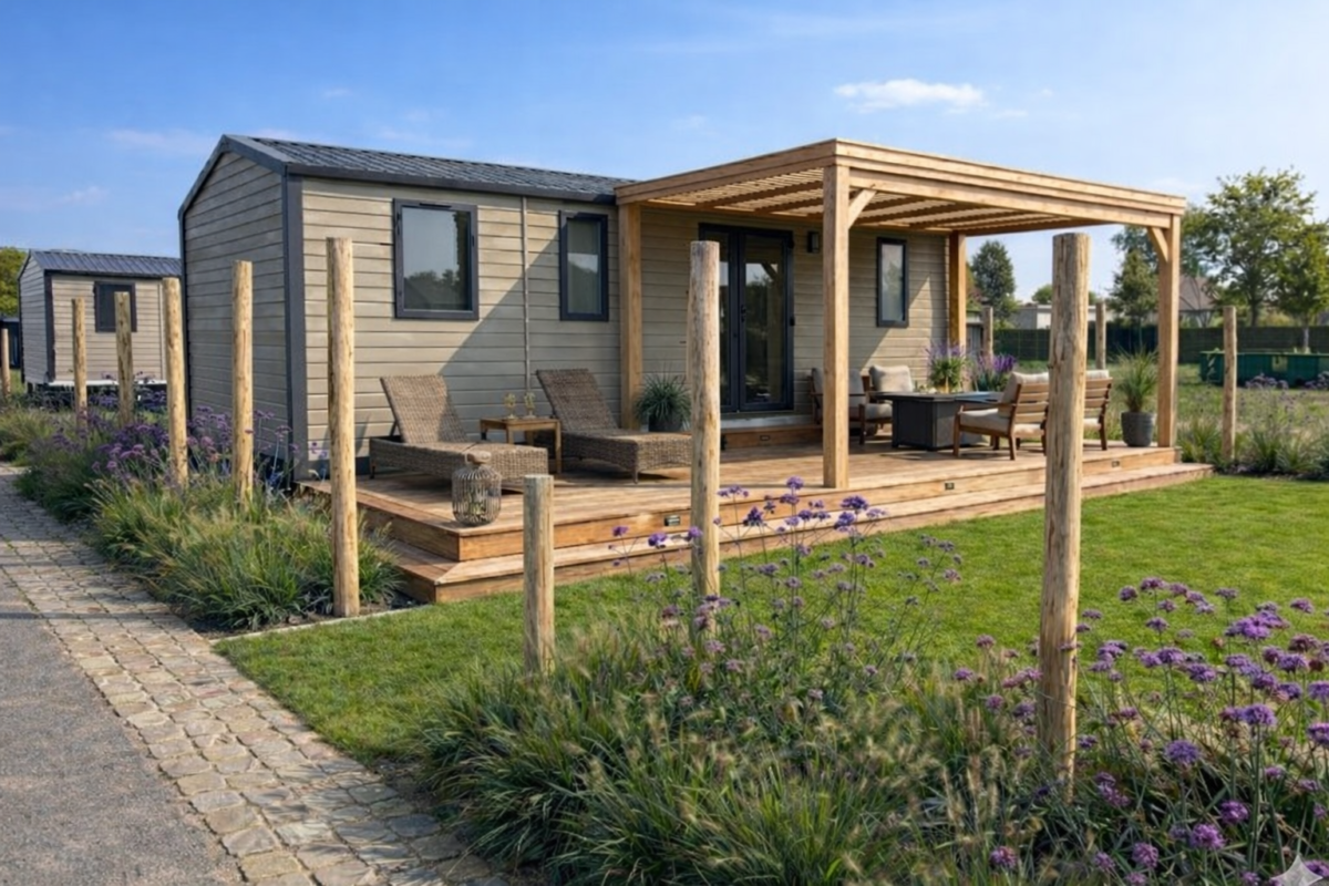 Volledig instapklaar en zorgeloos voor €69.995: transport, plaatsing, infrastructuuraansluiting, onderbouwafwerking en aangelegde tuin inbegrepen, met gratis tuinonderhoud.