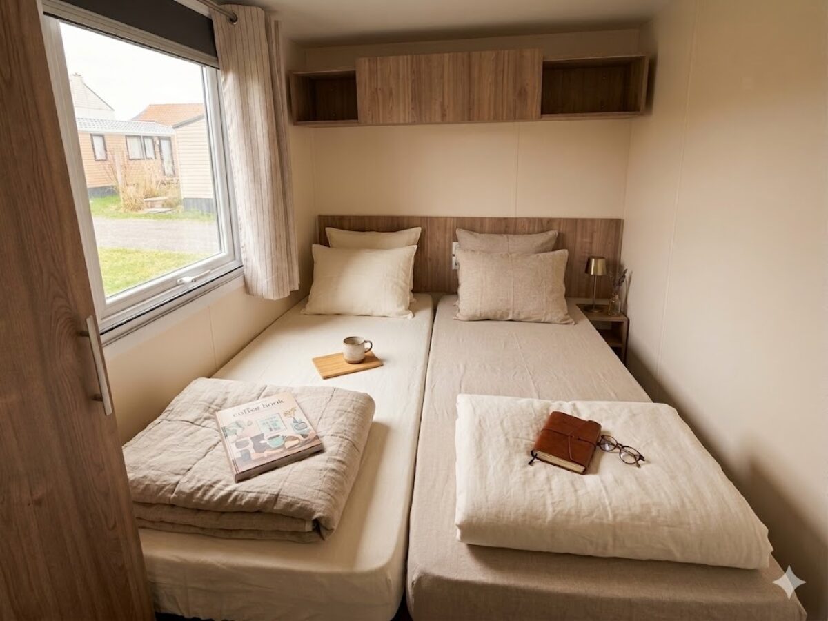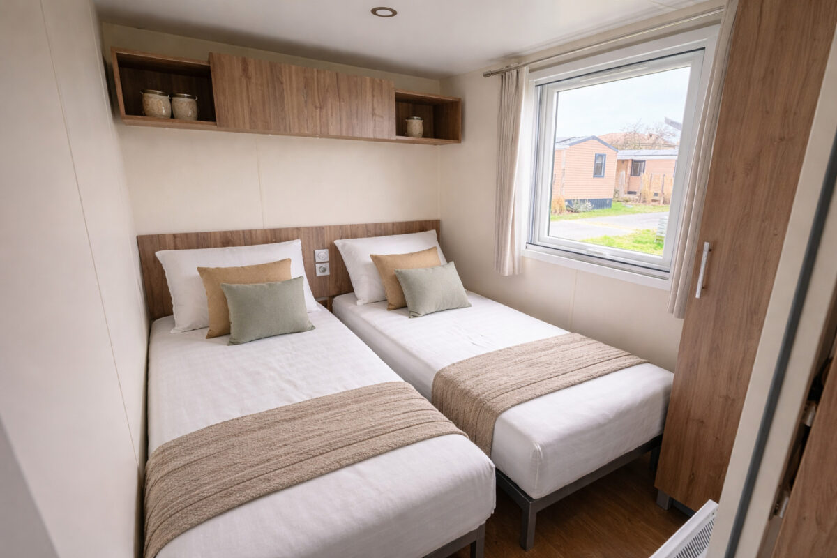 • 2 identieke slaapkamers met elk 2 bedden 80 x 190 cm matras van allergievrij schuim met hoge veerkracht 35 kg/m3,